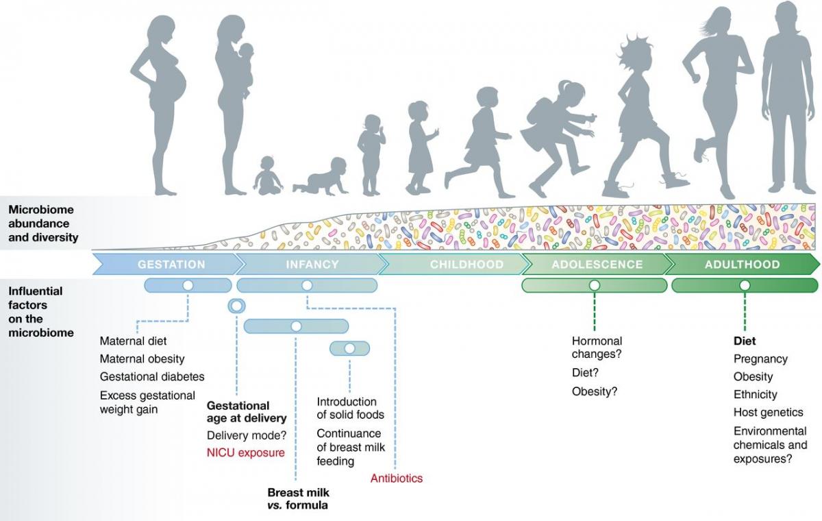 Figura 1: Importanti fattori di modificazione si pensa influenzino il microbiota per tutta la vita