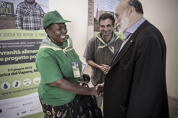 In questa seconda giornata di Expo dei Popoli, che ha chiamato a raccolta oltre 180 delegati di movimenti contadini provenienti da più di 50 Paesi, Carlo Petrini ha incontrato Elizabeth Mpofu, contadina dello Zimbabwe e coordinatrice generale del movimento contadino La Via Campesina, in un dibattito intitolato “Proteggere la biodiversità e garantire l'accesso alle risorse genetiche da parte dei contadini e dei popoli”.