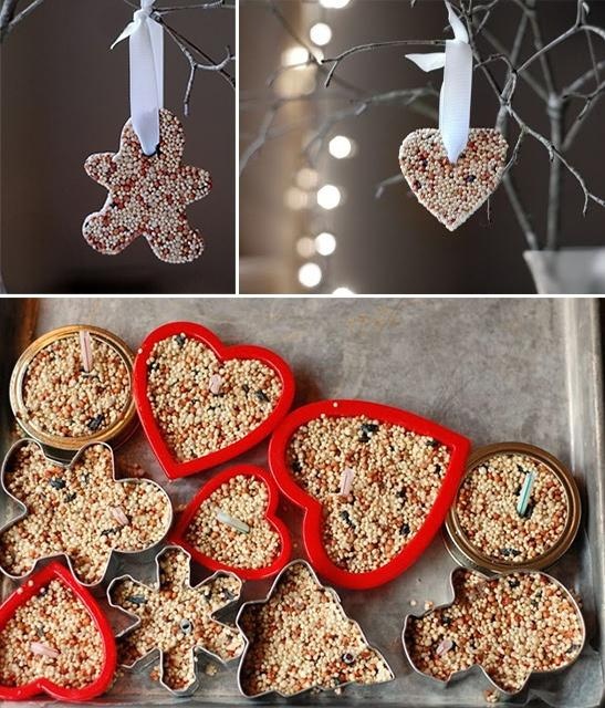 Ancora: delle vecchie lampadine svuotate dei filamenti e riempite con neve finta e piccoli alberelli, dei nastri in feltro arrottolati e fissati con un filo, dei biscotti ricoperti di perline e granella diventano decorazioni suggestive e personali: