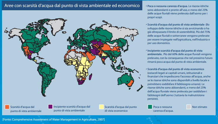 La mancanza d’acqua è un concetto relativo, poiché può riferirsi sia alla mancanza assoluta d’acqua, sia alla difficoltà d’accesso a delle riserve idriche sicure. Su tutti i continenti le risorse idriche sono sempre più sfruttate dalla crescente richiesta di interventi irrigui per scopi agricoli, per le opere di urbanizzazione e per uso industriale. Lo sviluppo economico e la crescita urbanistica spesso provocano danni ai corsi d’acqua dolce a causa dell’aumento dell’inquinamento.