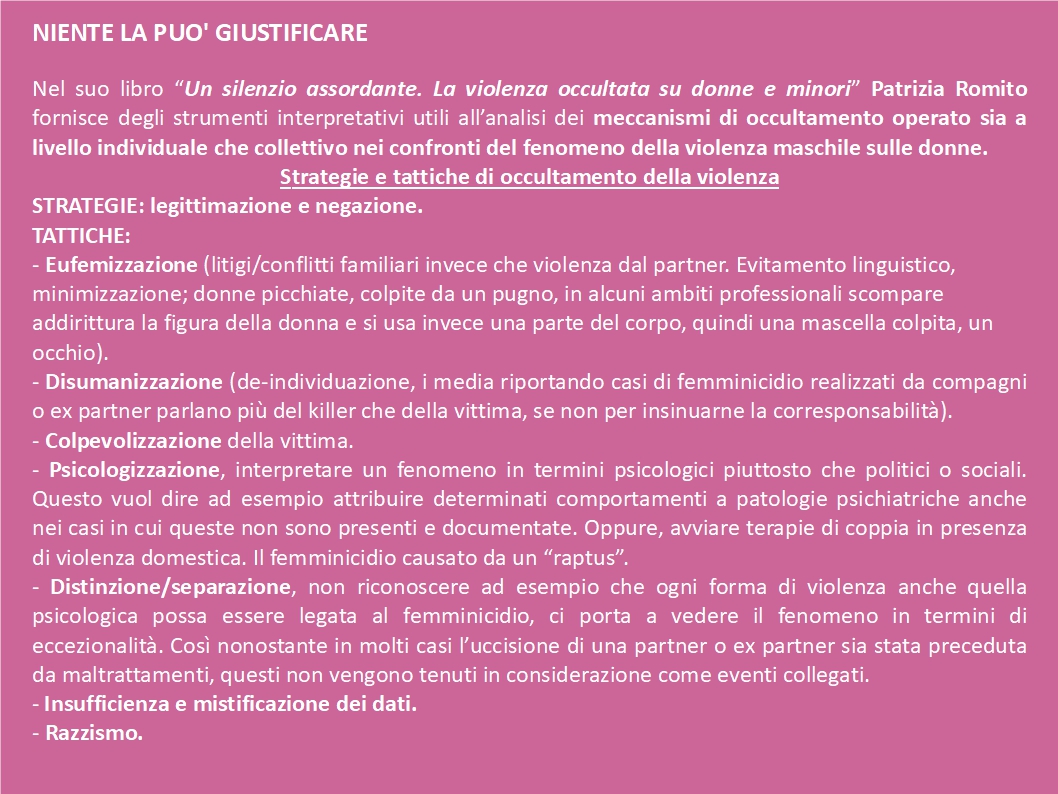Quindi è comprensibile che oggi, a pochi anni da una serie di conquiste e diritti, le donne continuino a non riconoscere e a negare la violenza di coloro che per secoli sono stati la fonte della loro oppressione.