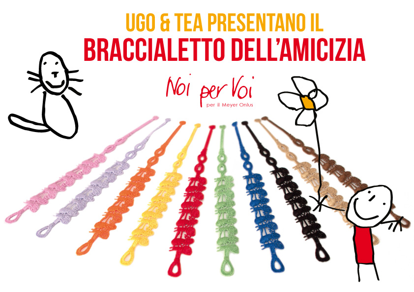 Colorati, simpatici e allegri, i braccialetti sono molto più di un semplice accessorio: indossati al polso essi rappresentano il simbolo dell’amicizia poiché uniscono chi lo regala a chi lo riceve e in più creano un doppio legame con i bambini del Reparto di Oncoematologia Pediatrica dell’Ospedale Meyer di Firenze. I braccialetti sono infatti anche un piccolo dono solidale. Ordinandoli direttamente sul sito della Noi per Voi, con un’offerta di 6 euro (spese di spedizione incluse), potrete contribuire al sostegno della ricerca scientifica sui tumori cerebrali che rappresentano ancora un’importante sfida in campo oncologico pediatrico. I braccialetti, realizzati in macramè, sono disponibili in 10 bellissimi colori ed hanno come protagonisti le mascotte dell'associazione Ugo e Tea (...scoprite qui chi sono leggendo la loro tenera storia!).