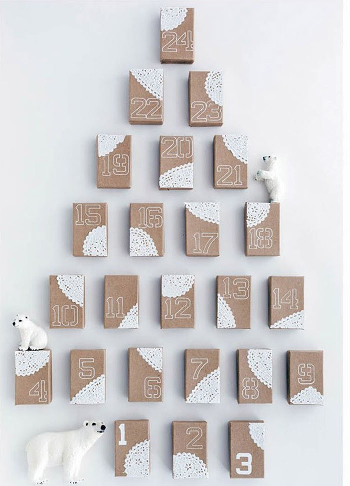 Non dimentichiamo il calendario dell'Avvento, più ecologico che mai con piccole scatole di carta attaccate al muro per un conto alla rovescia speciale: