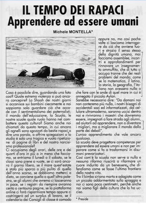 Ci occupiamo degli orari, delle ore e dei quarti d'ora in più o in meno che facciamo, se entriamo il lunedì o il sabato, se le classi sono piene o vuote, se ci sarà ancora il giorno libero, se il mare quest'estate è stato più sporco o più pulito di quello dell'anno scorso, se dobbiamo metterci a dieta, se conviene quella o quell'altra palestra, se gli alunni che avremo ci lasceranno in pace, se i registri da riempire avranno cento o centouno pagine, se la piattaforma online ci farà risparmiare tempo oppure ci costringerà ad un surplus di lavoro, se il calendario dei Consigli di classe è comodo oppure no, ma così poche volte ci lasciamo interrogare da ciò che avviene fuori e strazia il senso stesso della dignità umana, mai facciamo assemblee, incontri e approfondimenti per rinnovare un insegnamento ammuffito, che di tutto si occupa tranne che dei reali problemi del mondo; come se la matematica, il latino, la storia, la geografia, l'italiano non avessero nulla che vedere con le onde di quel mare in cui è annegato il piccolo Aylan.