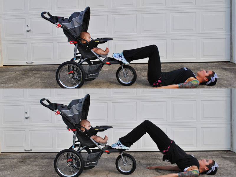7) Ponte a terra: stendi la schiena a terra e appoggia i piedi sul poggiapiedi del passeggino, braccia lungo il busto- solleva il bacino da terra contraendo i glutei.