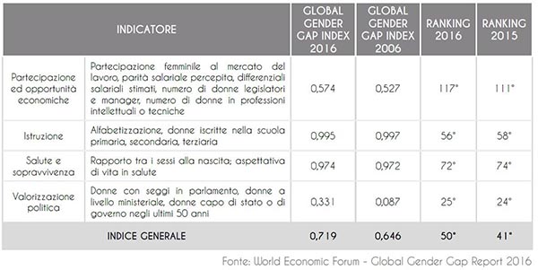 Lo ha detto chiaramente il Global Gender Gap Index del Wef: l'Italia è scivolata al 50° posto nel 2016 (partendo dal 41° posto) su 144 Paesi analizzati. Per quanto riguarda le opportunità economiche siamo al 117° posto e in termini di retribuzione a parità di ruolo siamo al 127° posto.